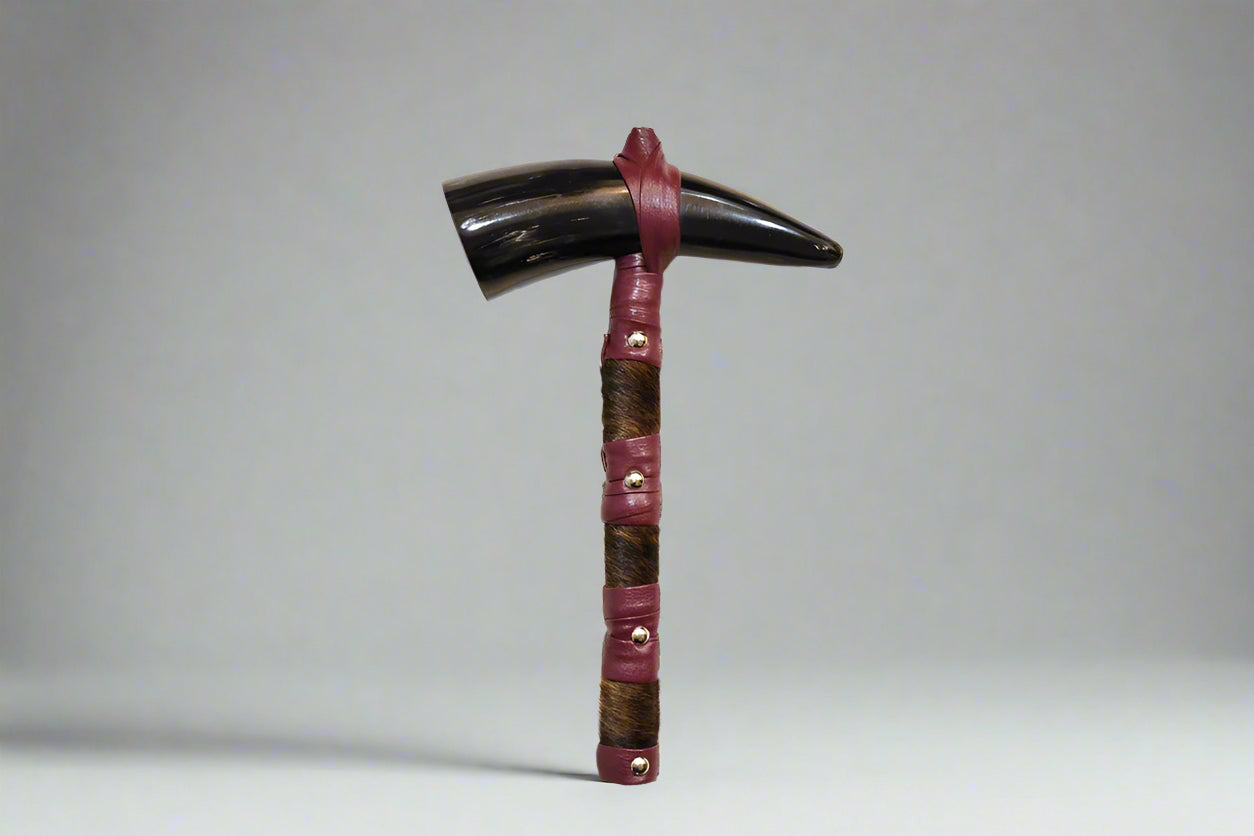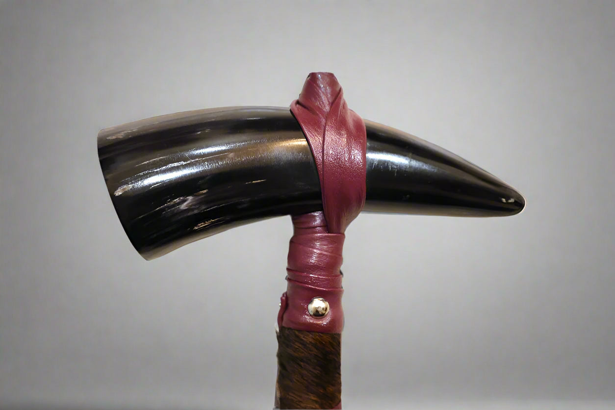 Meticulously handcrafted by our family-owned business with over 90 years of experience in horn craftsmanship, this unique horn rattle is made from GENUINE steer horn. The handle is securely wrapped in genuine cowhide and faux leather. Each piece is carefully selected for its distinctive appearance, ensuring no two rattles are exactly alike. Whether used for sound production, or as a display item, it’s a striking blend of form and function that embodies the spirit of the Wild West.