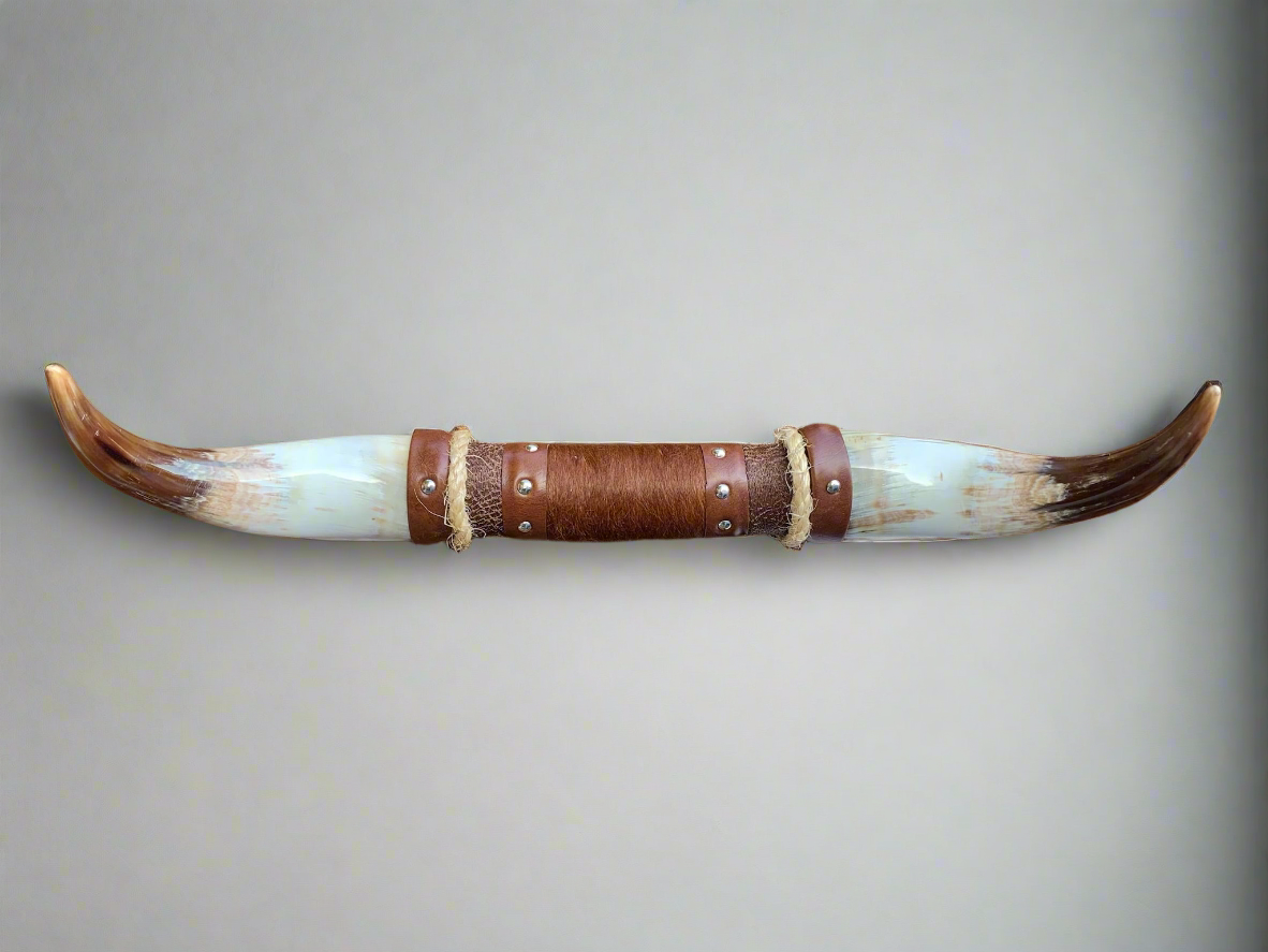 Celebrate the timeless spirit of the Wild West with our Mounted Steer Horns, meticulously handcrafted by our family-owned business with over 90 years of experience in horn craftsmanship. Each set of GENUINE steer horns is selected for its unique beauty and natural shape, expertly mounted on a wooden plaque and decorated with a center block made of genuine cowhide and faux leather.