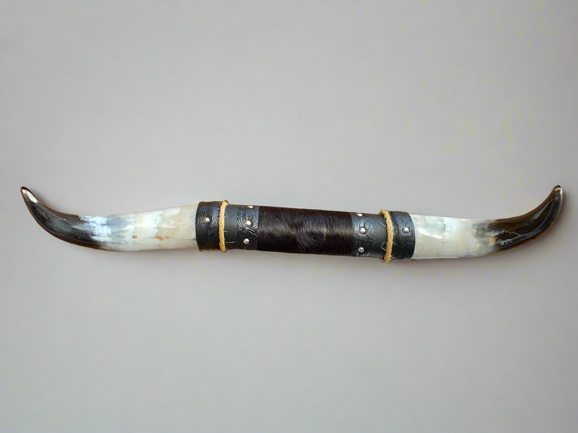 Celebrate the timeless spirit of the Wild West with our Mounted Steer Horns, meticulously handcrafted by our family-owned business with over 90 years of experience in horn craftsmanship. Each set of GENUINE steer horns is selected for its unique beauty and natural shape, expertly mounted on a wooden plaque and decorated with a center block made of genuine cowhide and faux leather.