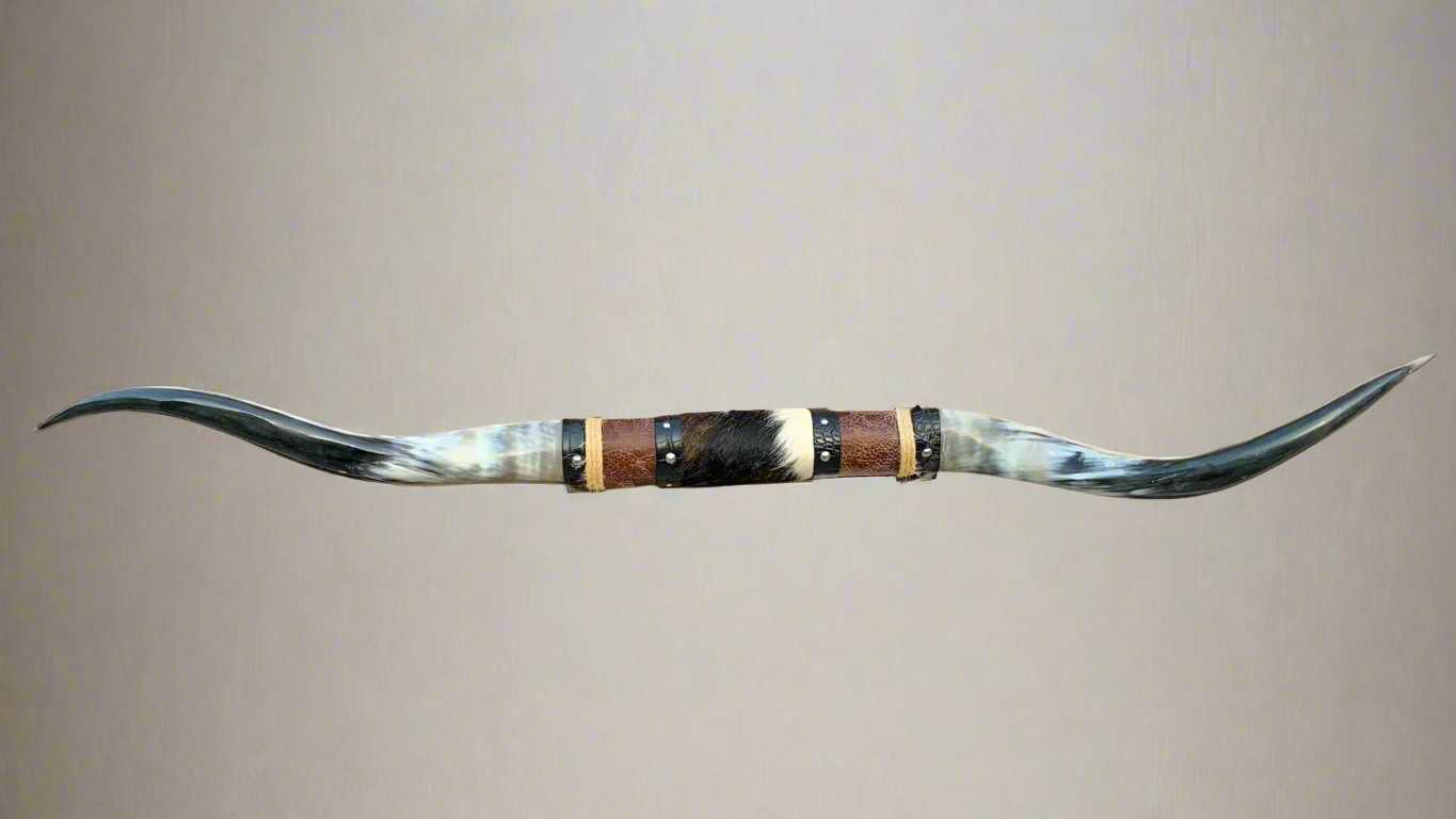 Celebrate the timeless spirit of the Wild West with our Mounted Steer Horns, meticulously handcrafted by our family-owned business with over 90 years of experience in horn craftsmanship. Each set of GENUINE steer horns is selected for its unique beauty and natural shape, expertly mounted on a wooden plaque and decorated with a center block made of genuine cowhide and faux leather.