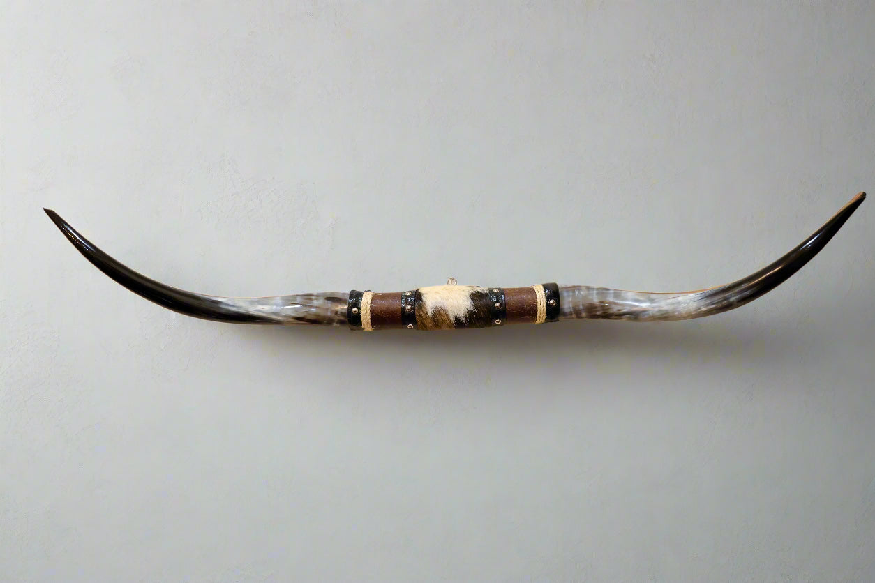Celebrate the timeless spirit of the Wild West with our Mounted Steer Horns, meticulously handcrafted by our family-owned business with over 90 years of experience in horn craftsmanship. Each set of GENUINE steer horns is selected for its unique beauty and natural shape, expertly mounted on a wooden plaque and decorated with a center block made of genuine cowhide and faux leather.