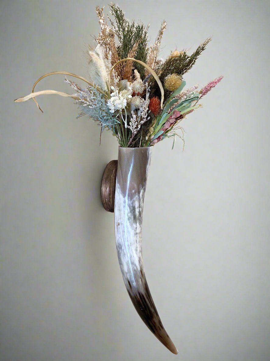 Bring the beauty of nature and rustic elegance into your home with our Steer Horn Wall Piece, meticulously handcrafted by our family-owned business with over 90 years of expertise in horn craftsmanship. This unique sconce features a GENUINE steer horn, carefully selected for its natural curves and distinct character, mounted on a sturdy wooden base.